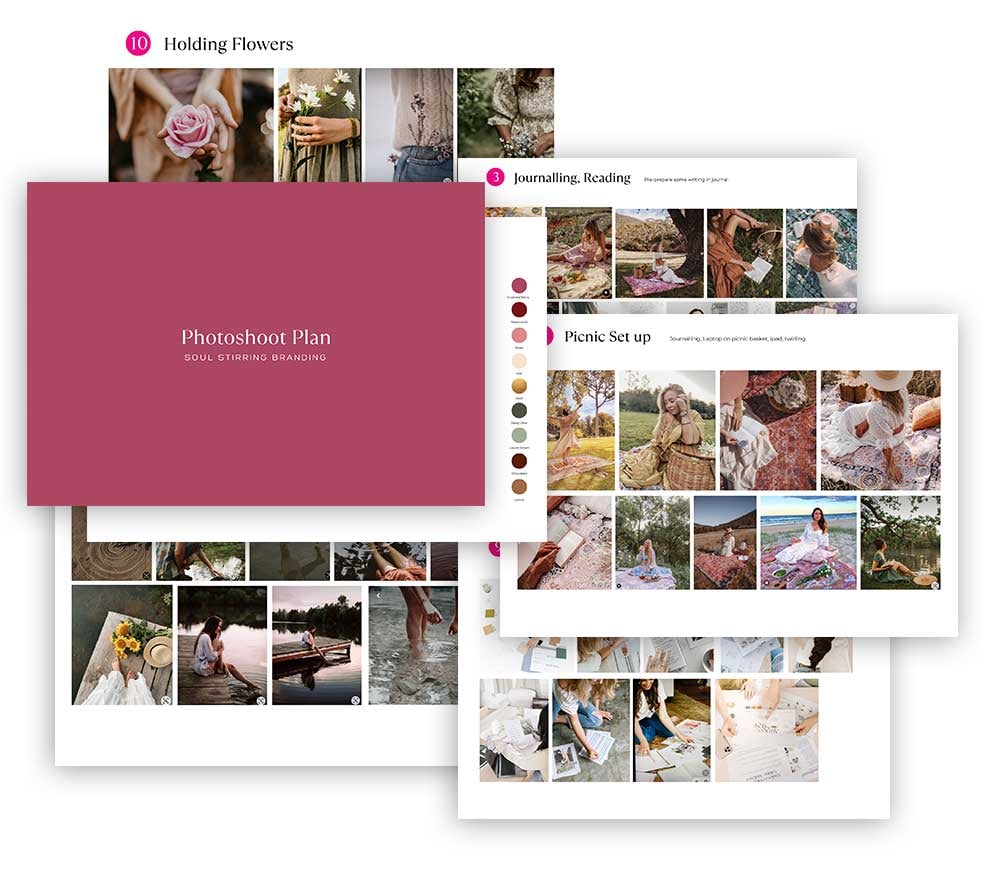 Here are some tips on how to put together a photoshoot plan. I recommend creating a landscape document in Canva as your base, then you can drop in images and text to map out what you want your shoot to look like.